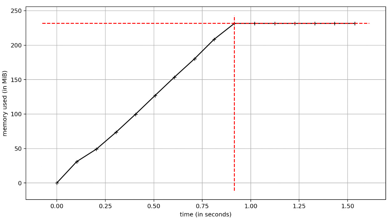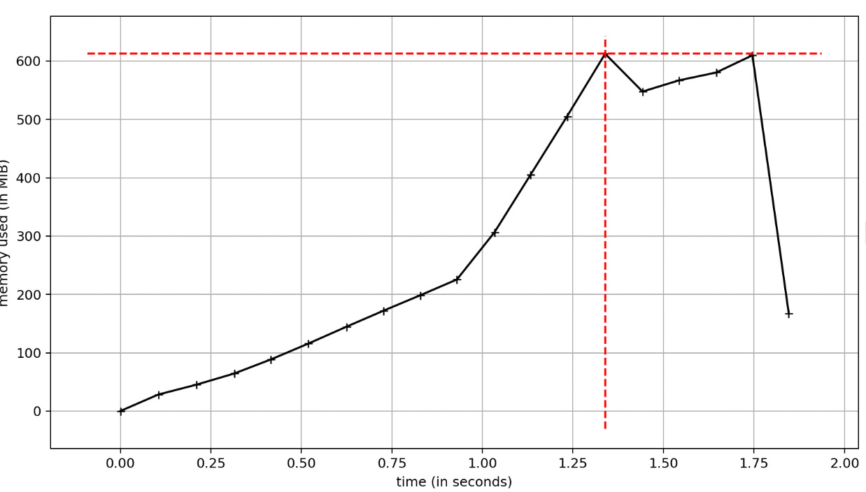 print(counter)Vamos a empezar con la forma más simple: Una única query a la tabla employees que va a intentar sacar el millón de registros de una sentada. El proceso corre deprisa, pero si miramos cuánta memoria nos estamos comiendo, llega por encima de los 600MB.